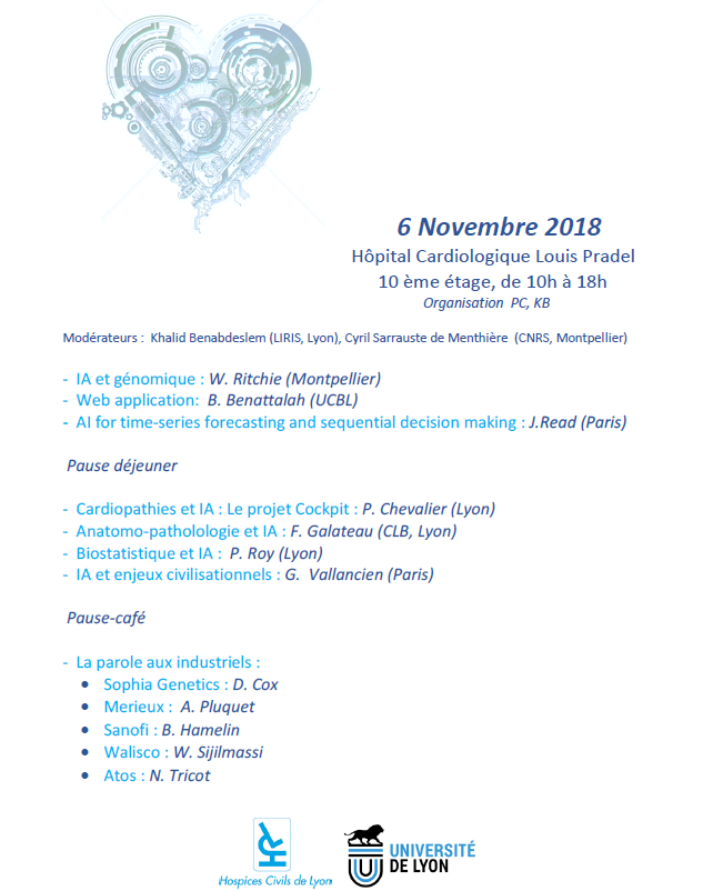 Découvrez le programme du Colloque "Intelligence Artificielle et médecine personnalisée" qui aura lieu le 6 Novembre 2018 à l'H?pital Cardiologique Louis Pradel - 10 ème étage, de 10h à 18h (pause déjeuné incluse).