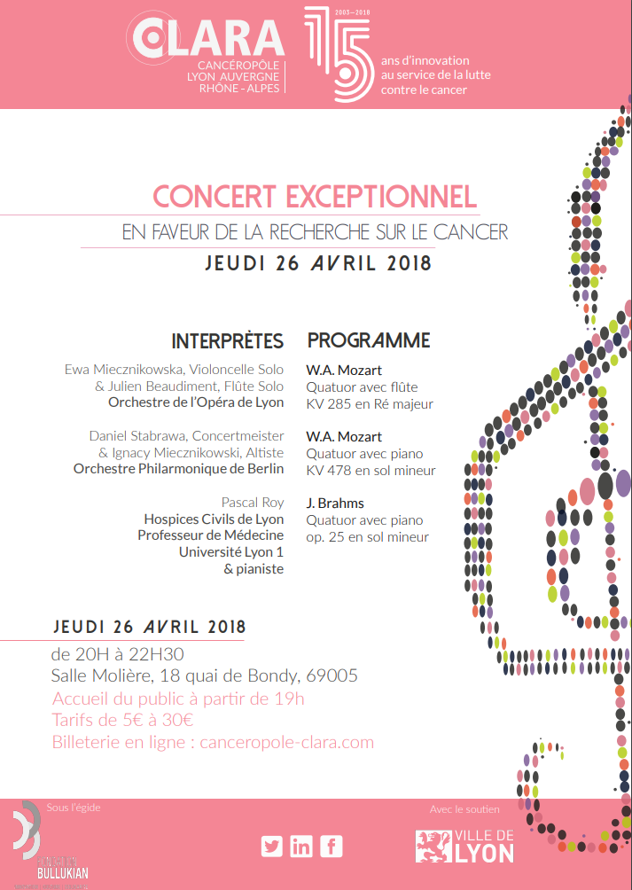 Soutenez la recherche sur le cancer ! Le Cancérop?le Lyon Auvergne-Rh?ne-Alpes (CLARA) organise le jeudi 26 avril un concert caritatif de musique classique dont les fonds collectés seront entièrement dédiés à la recherche sur le cancer.